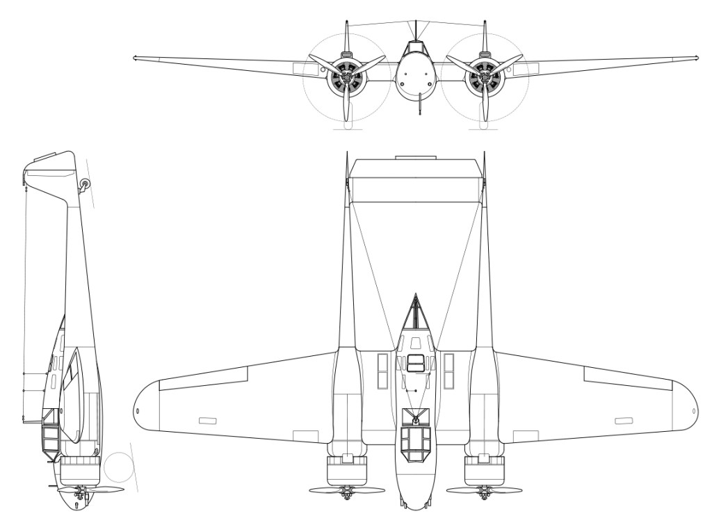 Sporrhjulet satt i mitten av den tvärgående stabilisatorn och huvudlandstället var infällbart i motorgondolerna.