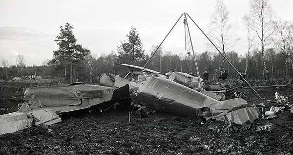 | 18320 | 480608 | 520517 | Haveri 500616. Ground-loop vid F 17. Vid normal landning/sättning erhölls 2-3 mindre studsar när sporrhjulet tog mark och under sista delen av utrullningen fick fpl tendens till högersväng varför ff ansatte vänster broms som dock tog dåligt. När girrörelsen syntes vara hävd släppte ff bromsen varvid fpl mycket kraftigt svängde åt höger och båda landställsbenen bröts av. Fpl sladdade 20 m, gjorde ett hopp på 9 m innan det stannade. Ff (öv, AFT) och fsig (fj) oskadade. Framkroppen översänd till CVV för reparation, vilken kan påbörjas tidigast i december 1952. Från fpl har delar lånats i stor utsträckning (för utbytesbuffert 400 tim tillsyn). Med hänsyn till den långa leveranstiden på framkroppen, lång arbetstid för montering av framkroppen med fpl samt anskaffningssvårigheter och långa leveranstider på delar till fpl föreslås detsamma kasseras trots den låga återställningskostnaden. (FR, SFF) | F17- |