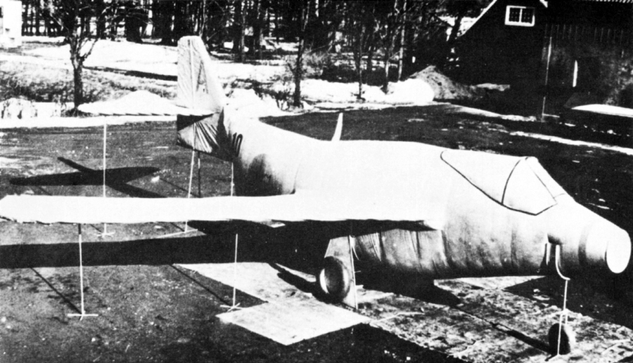 Bilderna blev hyfsade men på marken såg attrappen bedrövlig ut, bl a för att den inte hade blåsts upp med fullt tryck eftersom inga begränsningstrådar ännu fanns inne i vingarna (skulle utprovas). Hade fullt lufttryck anbringats så hade vingarna fått formen av bulliga, avlånga korvar! Försöken avbröts och man satsade istället på maskering av flygplanen.[3]