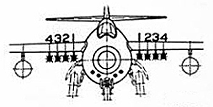 Flygplanet hade fästpunkter för montering av 8 ”balkar” för raket- eller robotställ. Den inre balken (balk 1) kunde dock bara bära EN mindre raket pga landningsstället. Det fanns även 2 fasta yttre balkar för fälltankar eller brandbomber.