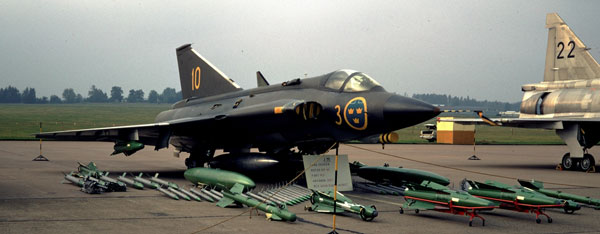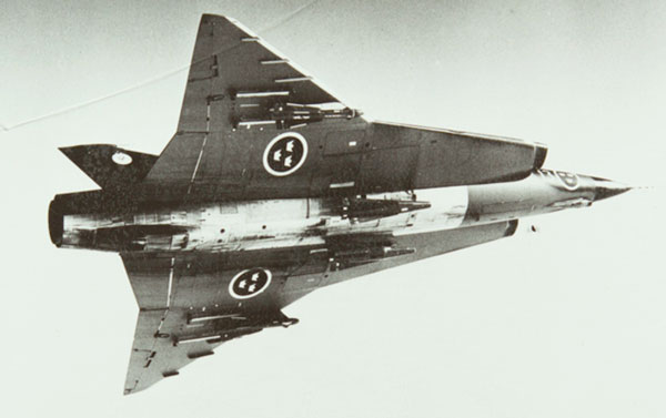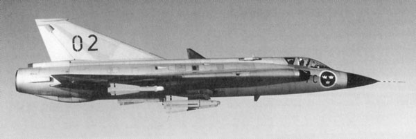 Vid ett första anfall på mötande kurs med målet bestod beväpningen av fyra Falcon-robotar: RB 27 med radarmålsökare och RB 28 med IR-målsökare.