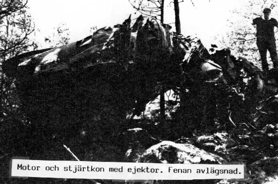 Under inflygning från söder för fingerat anfall med tregrupp mot sjömål i trakten av Landsort uppstod kraftiga motorstörningar i tvåans flygplan. Föraren avbröt uppdraget och steg på nordlig kurs för att försöka nå Tullinge (F 18). Efter flera resultatlösa återstartningsförsök tvingades han dock lämna flygplanet på 400 meters höjd. Föraren undkom oskadd. Flygplanet slog ned ca 5 km VSV Ösmo och totalförstördes. Haveriet inträffade kl 09:34.