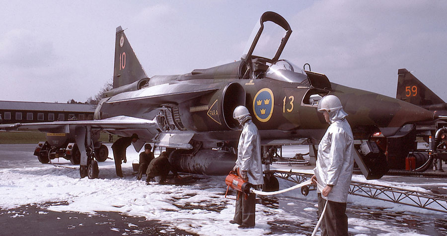 | 1973-10-09 AJ 37042 RM8A 9007 | Serietillverkat fpl fattade eld på marken under start. Linköping. Ff (KGL) hoppade ur fpl och klarade sig oskadd. Orsak: Kompressorn havererade pga nötkorrosionsskador på kompressorfläktskiva nr 1. | SAAB |