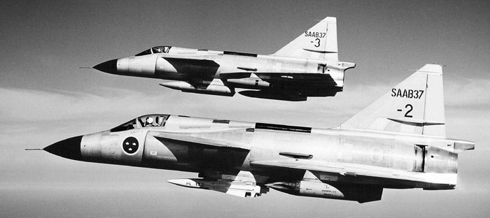 37XE: Under slutet av 1960-talet visade RAF ett flyktigt intresse för Viggen. I mitten av 1967 skickades en specifikation till Saab där man krävde två besättningsmän, två motorer samt avsevärt ökad räckvidd. Saab överlämnade tre olika Viggen-varianter vid ett hemligt möte i London 1967-08-18: