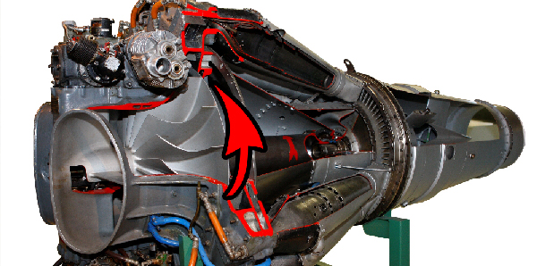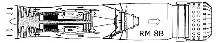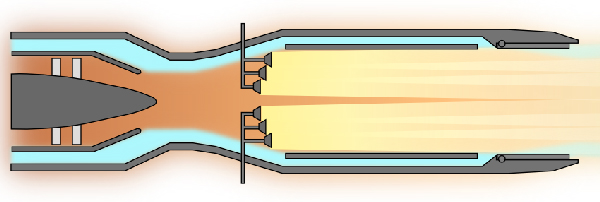 Med tiden fann man att det var fördelaktigt, både med avseende på buller och verkningsgrad, att låta en del av luftströmmen passera förbi utanför brännkamrarna och blandas med de heta förbränningsgaserna i utloppet. Den kalla luftströmmen utmed yttermanteln kylde även ner motorns temperatur.