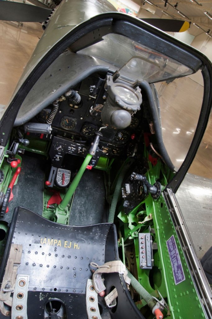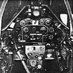 Flyginstrumenten i mitten och till vänster, motorinstrumenten till höger. Framför spaken syns tankväljaren och nederst till höger blinkerflödesindikatorn för syrgasanläggningen. Trimratt längst till vänster.