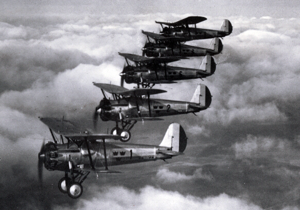 | Fem fpl J 7 från F 1 i Västerås vid Skånemanövern i september 1935. Foto: Okänd / Flygvapenmuseum (PDM). |