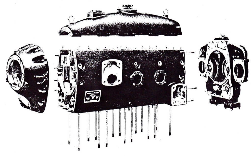 Vevhuset är gjutet i elektron och är bl.a. försett med fem fästbryggor för vevaxelns huvudlager. Den främre delen innehåller ett radiaxlager för infästning av propellernavets drivenhet. Överdelen är tillika oljetank, försett med påfyllningsstuds och två lyftöglor. Vevhusets bakre del utgör även fäste för div. hjälpapparater.