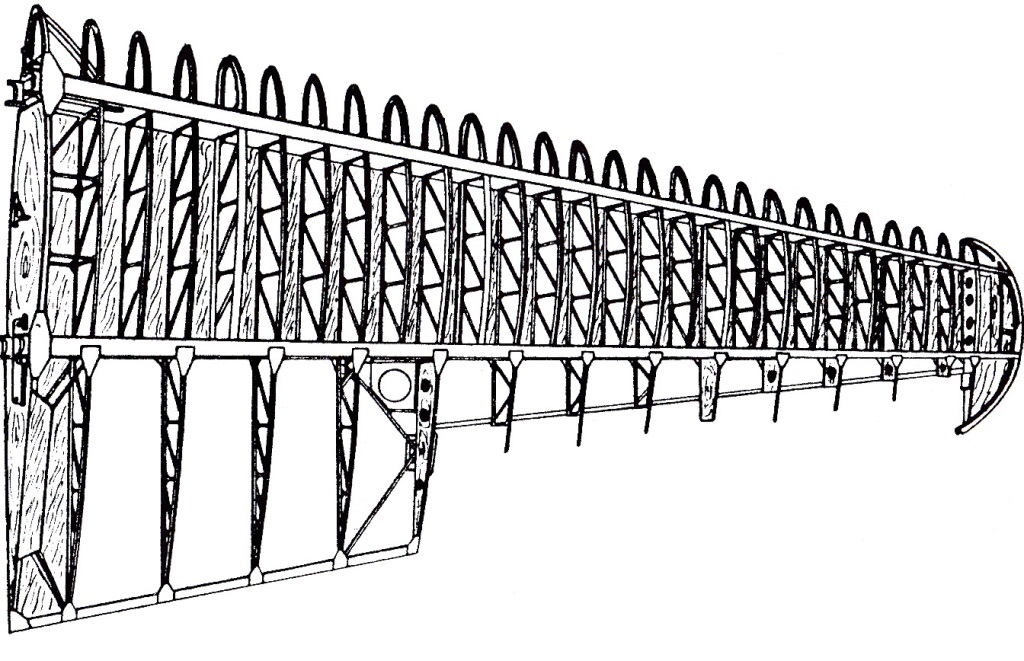 Vingstommen är av trä och uppbyggd av två lådbalkar, samt enkla stavspryglar. Vingens framkant, över- samt undersida mellan vingbalkarna, bakkant vid skevrodren, samt över- och -undersida vid vingroten är klädda med fanér. I övrigt utgörs klädseln av duk.