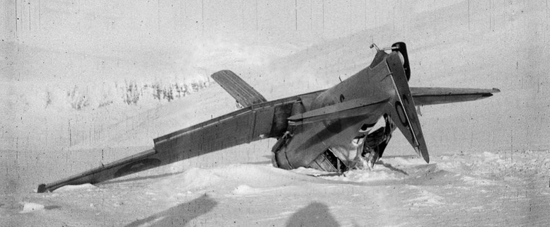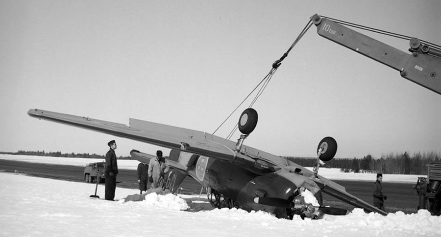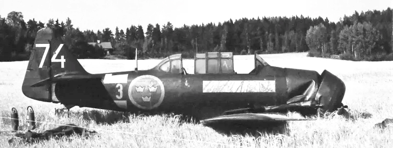 Flygplanet hamnade upp och ner med avbrutna vingar. Ff (2.ffl Max-Ove Karlberg) fick skäras loss ur selen innan han kunde hjälpas ut ur kabinen.