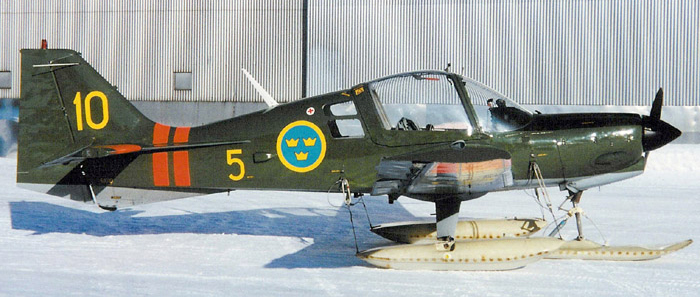 Prov med skidställ, främst för Arméns räkning, utfördes i Norrland vid RFN i Vidsel. Olika typer av skidor testades (bl a amerikanska och finska) och valet föll slutligen på de finska Lentohuoltoskidorna. Skidorna blev dock för tung för flygplanet och FMV-F:T på Malmen fick i uppdrag att vidareutveckla (TIFF 1980-1, sid 40) skidstället. De kom nu att tillverkades av glasfiberarmerad plast och vallades med värme som proffsskidåkarna gör. Skidorna fästes på ordinarie hjulaxel och nosskidan styrdes upp av fjädercylindrar och huvudskidorna av konventionella amortisörer.
