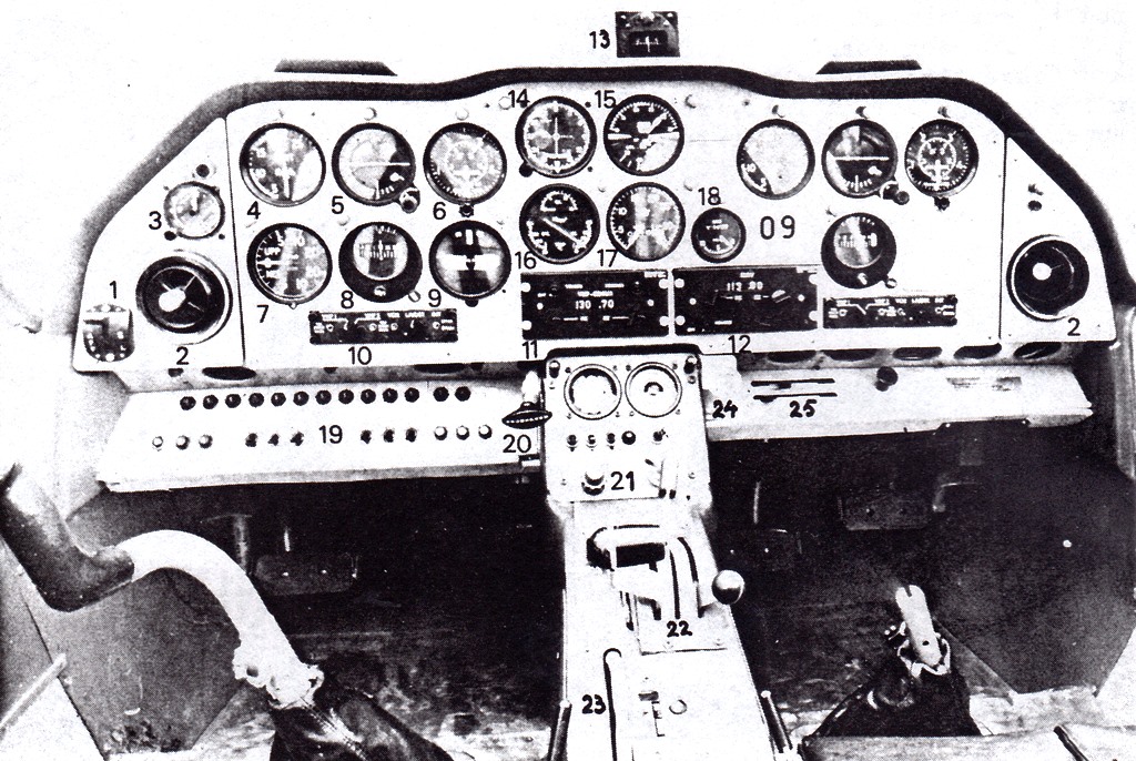 | 8. Kursgyro | 21. Bränslemätare, V/A-meter, Generatorpanel, Startswitch |