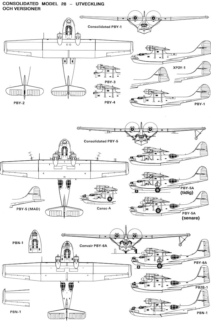 Den fortsatta utvecklingen av Consolidated’s Model 28 – i historien resulterande i PBY-2, -3 och -4 – är ur vår synvinkel kanske mindre intressant. Som rena flygbåtar är dess tjänst i US Navy, likväl som i ett flertal allierade länders luft- och sjöstridskrafter under det andra världskriget, så väl dokumenterat i andra sammanhang, att det inte tas upp här.